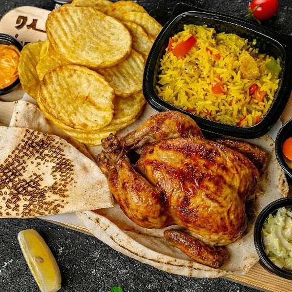 ولتكون السفرة ملوكية عن حق وحقيق، بتجيكم الوجبة مع جيش من المقبلات: صحن رز كبير يكفي العيلة، وبطاطا مقلية سخنة ومقرمشة، ومعهم علبتين توم أصلي، وصحن مخلل مشكل، مع خبز طري وكاتشب.